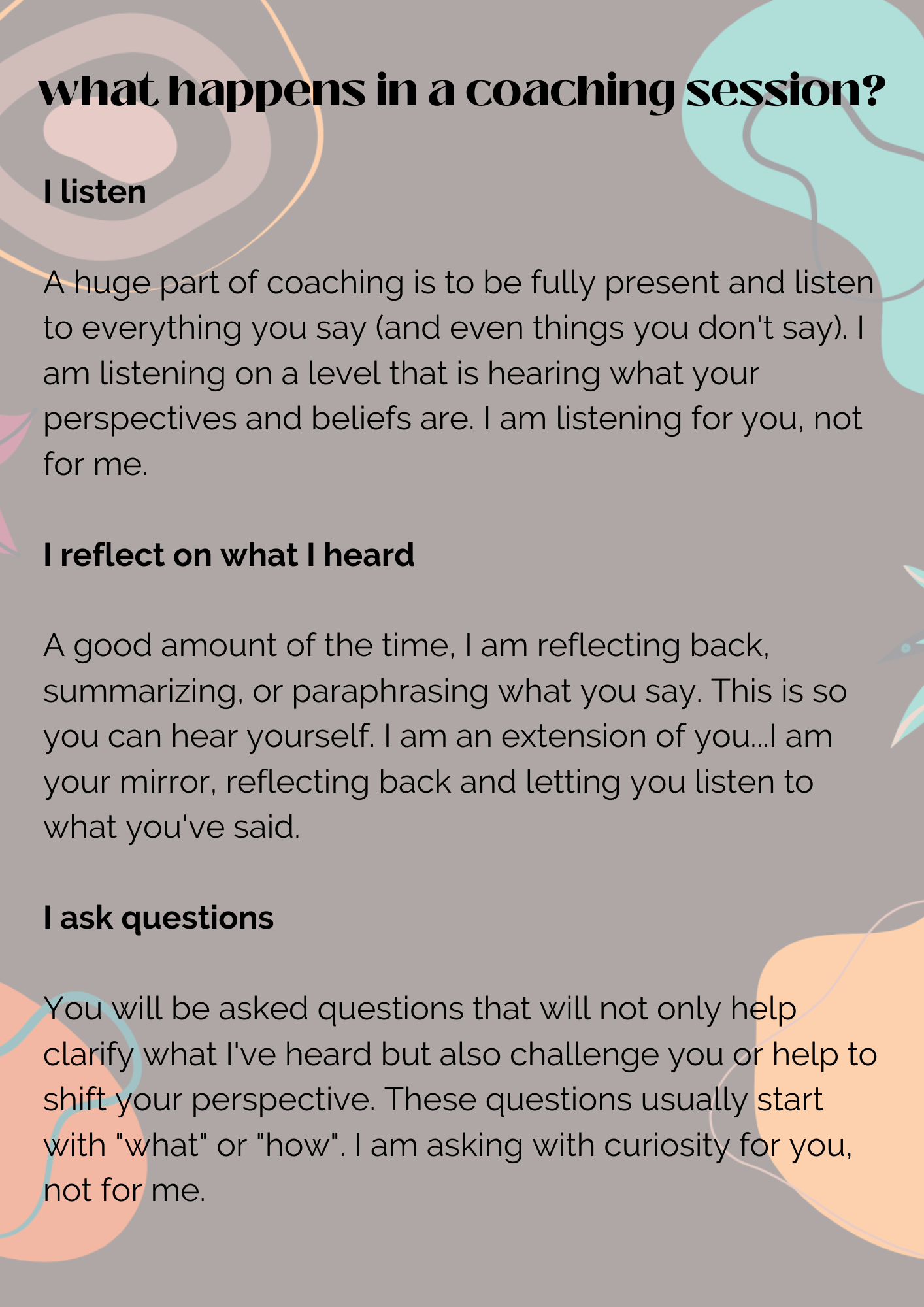 A free 30 minute exploration session, no strings attached, to see if coaching is right for you.
